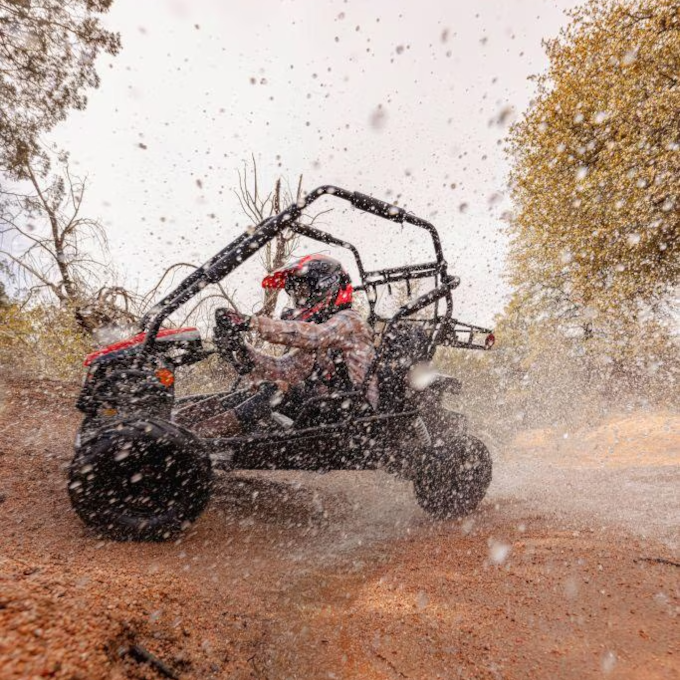 With independent adjustable suspension, low-pressure tires, and LED headlights, this kart is ready for daytime or nighttime adventure. The convenient pull-start system makes it simple to fire up and ride, while the inclusion of reverse gear ensures easy maneuvering in tight spaces. Rugged, comfortable, and capable, the GK200 is a great choice for recreational riding and family fun.